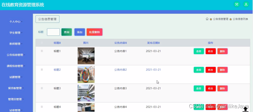 公告信息管理,在公告信息管理页面可以填写标题、图片、公告内容、发布日期等内容,并可根据需要对公告信息管理进行详情,修改或删除等操作,如图5-4所示。
