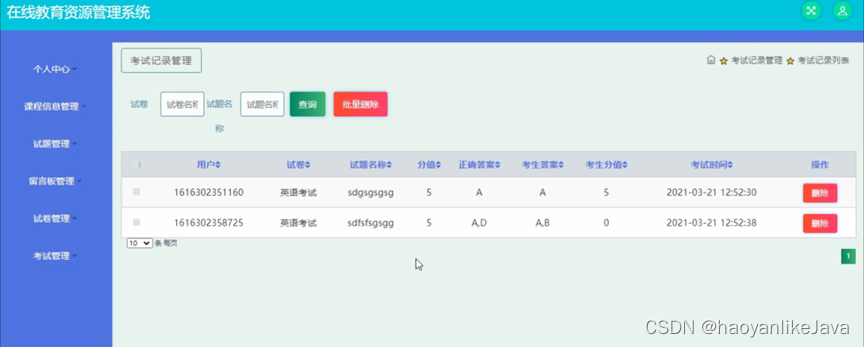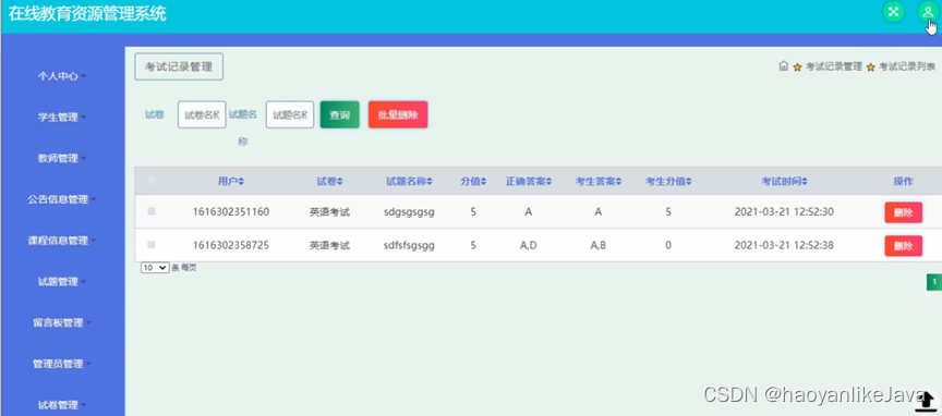 考试记录管理,在考试记录管理页面通过查看用户、试卷、试题名称、分值、正确答案、考生答案、考生分值、考试时间等内容并可根据需要对考试记录管理进行查看、删除,如图5-21所示。
