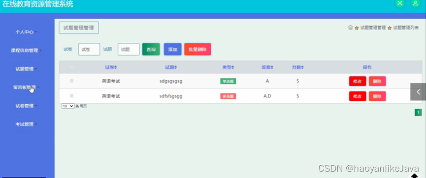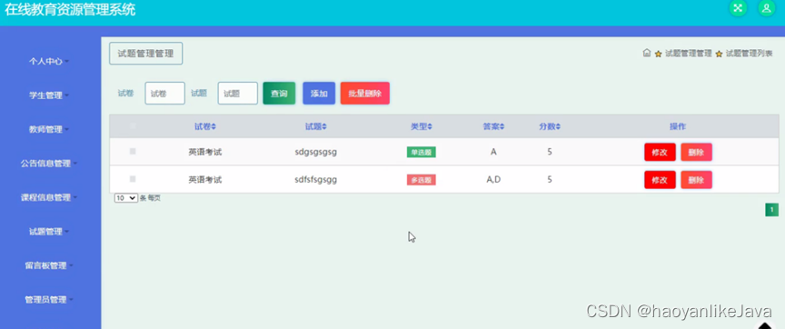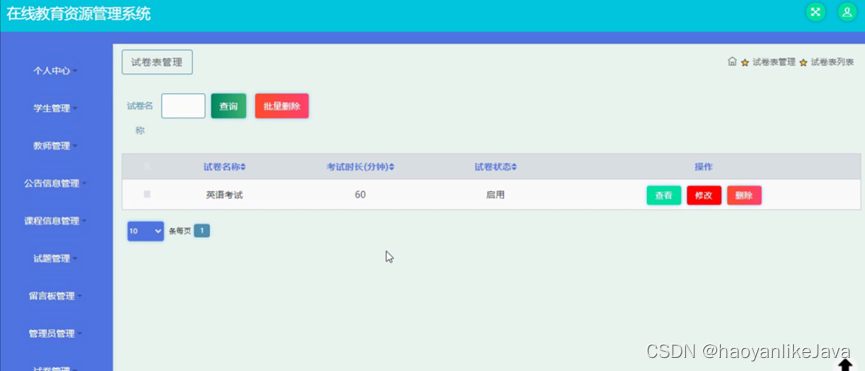 主要模块有:管理人员;个人中心,学生管理,教师管理,公告信息,课程信息,试题,留言板,管理员,试卷,系统,考试,学生;个人中心,留言板,考试,老师;个人中心,课程信息管理,试题管理,留言板,试卷管理,考试管理,前台主页;首页,公告信息,课程信息,考卷列表,留言反馈,我的,跳到后台等功能.在系统中,管理员的作用是安全、高效地存储和管理各类信息,还可以对系统进行管理与更新维护等操作,并对后台拥有相应的操作权限。