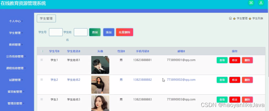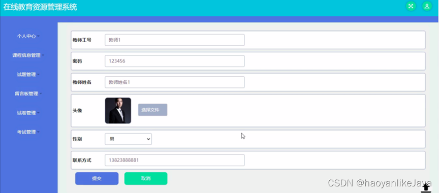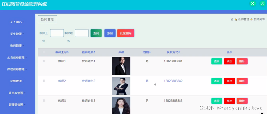 教师管理,在教师管理页面可以填写教师工号、教师姓名、头像、性别、联系方式等内容,并可根据需要对教师管理进行详情,修改或删除等操作,如图5-3所示。