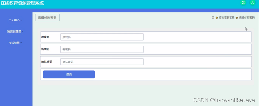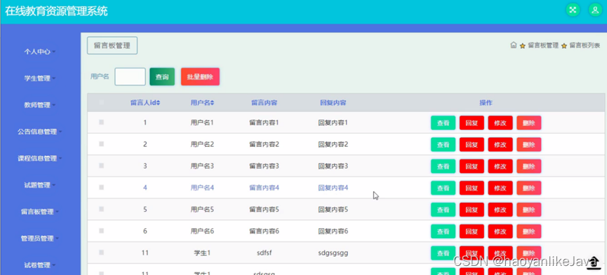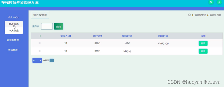 学生登录进入在线教育资源管理系统可以查看个人中心、留言板管理、考试管理等内容,如图5-10所示。