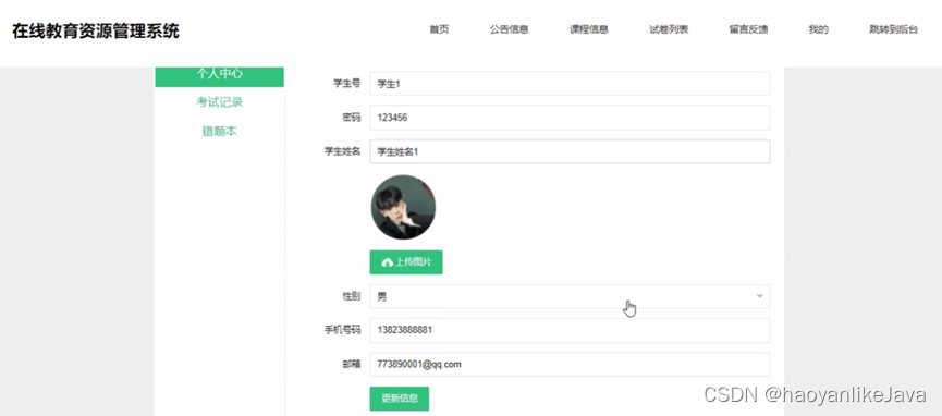 3、功能的完善性:管理员;个人中心,学生管理,教师管理,公告信息,课程信息,试题,留言板,管理员,试卷,系统,考试,学生;个人中心,留言板,考试,老师;个人中心,课程信息管理,试题管理,留言板,试卷管理,考试管理,前台主页;首页,公告信息,课程信息,考卷列表,留言反馈,我的,跳到了后台,修改和维护的模块。