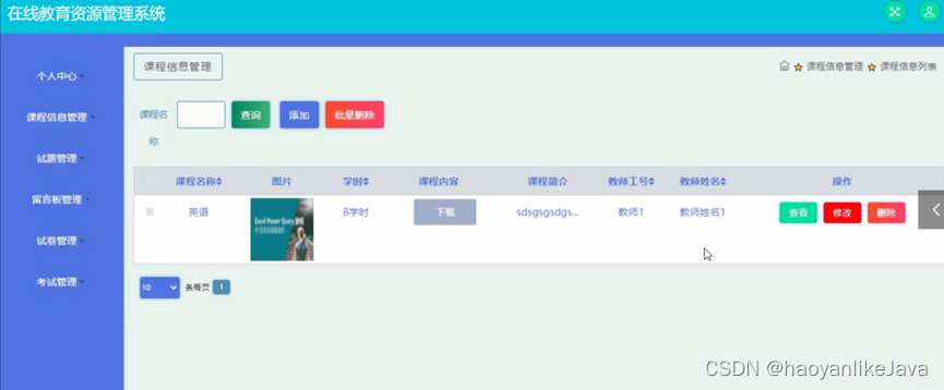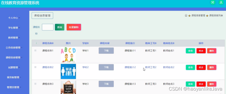 课程信息管理,在课程信息管理页面可以填写课程名称、图片、学时、课程内容、课程简介、教师工号、教师姓名等进行详情,修改,删除操作,如图5-5所示。