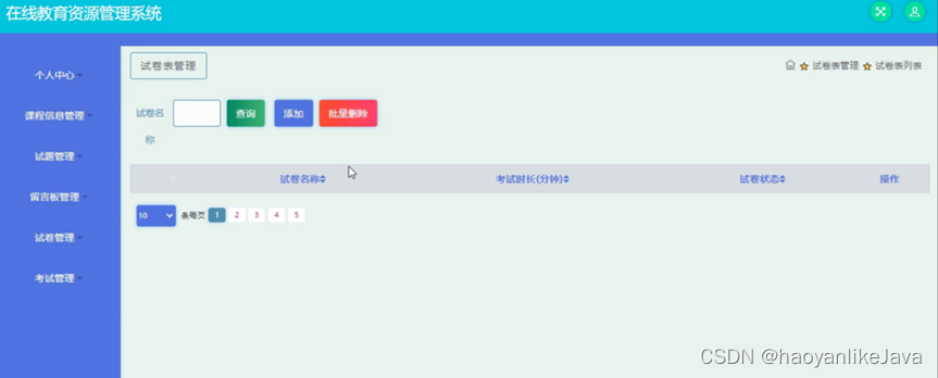 试卷管理,在试卷管理页面可以查看试卷名称、考试时长、试卷状态等内容,并可根据需要对试卷管理进行详情,修改,删除操作,如图5-7所示。