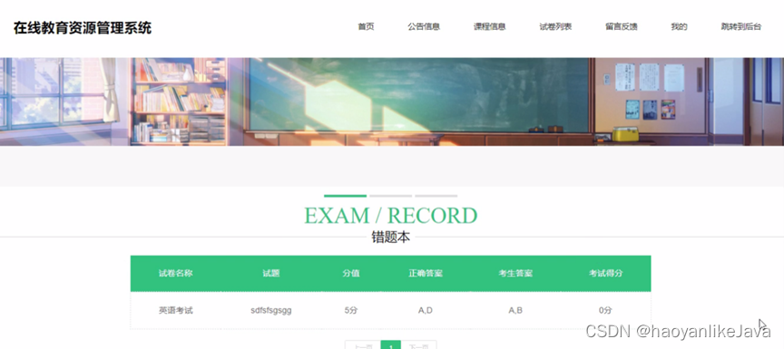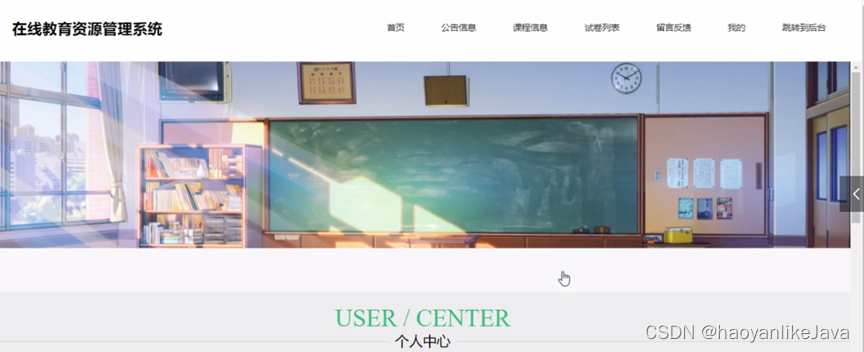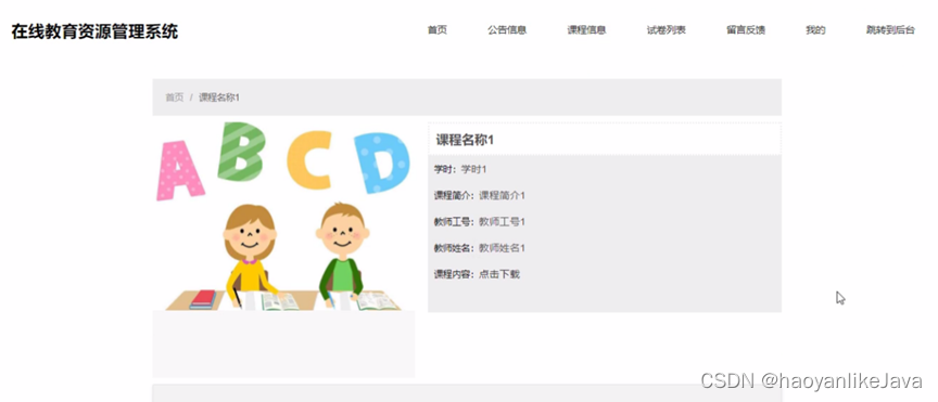 学生登录进入在线教育资源管理系统可以查看首页、公告信息、课程信息、试卷列表、留言反馈、我的、跳转到后台等内容,如图5-12所示。