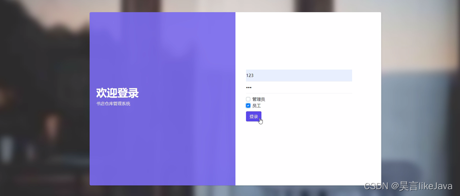 书店仓库管理系统,在员工登录系统的首页可以通过点击登录,可以填写员工工号、密码等信息进行登录操作等信息,如图5-14所示。