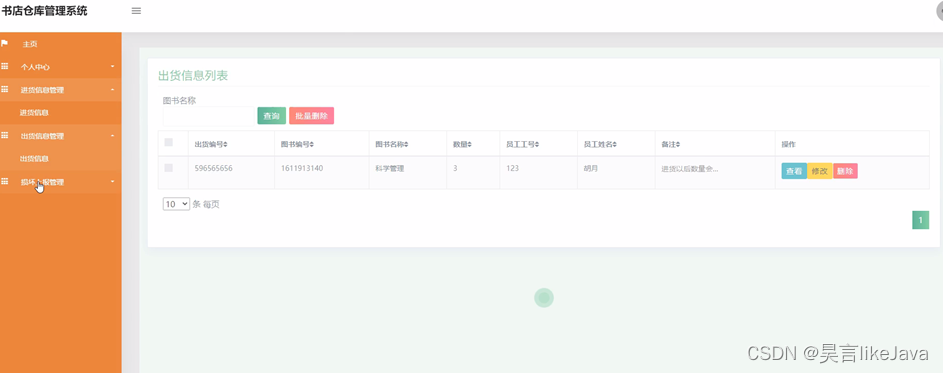 出货信息管理,通过内容列表可以获取出货编号、图书编号、图书名称、数量、员工工号、员工姓名等信息可进行查看、修改、删除或查看操作,如图5-16所示。