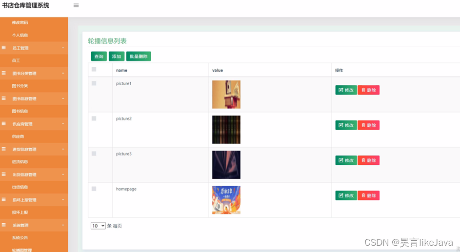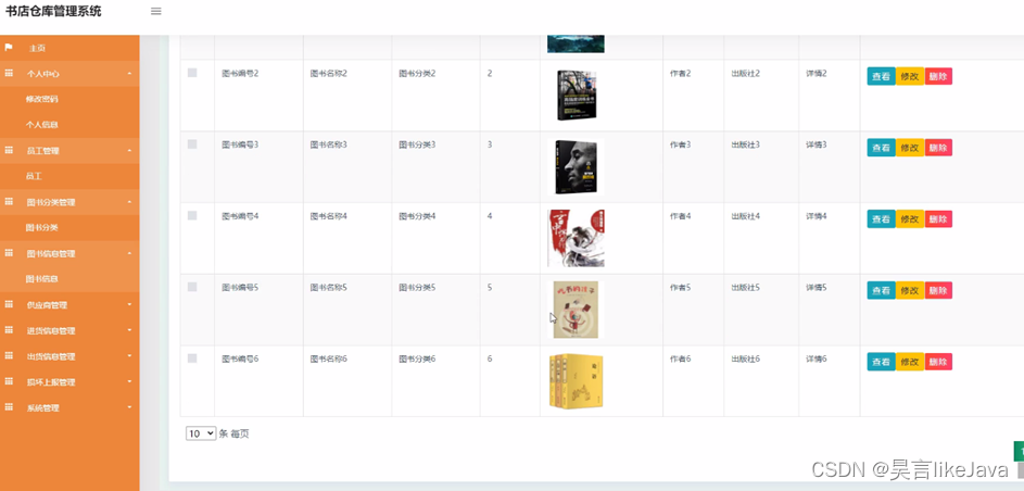 图书信息管理:管理员通过列表可以获取图书编号、图书名称、图书分类、数量、图片、作者、出版社、详情等信息,进行修改或删除操作,如图5-5所示。