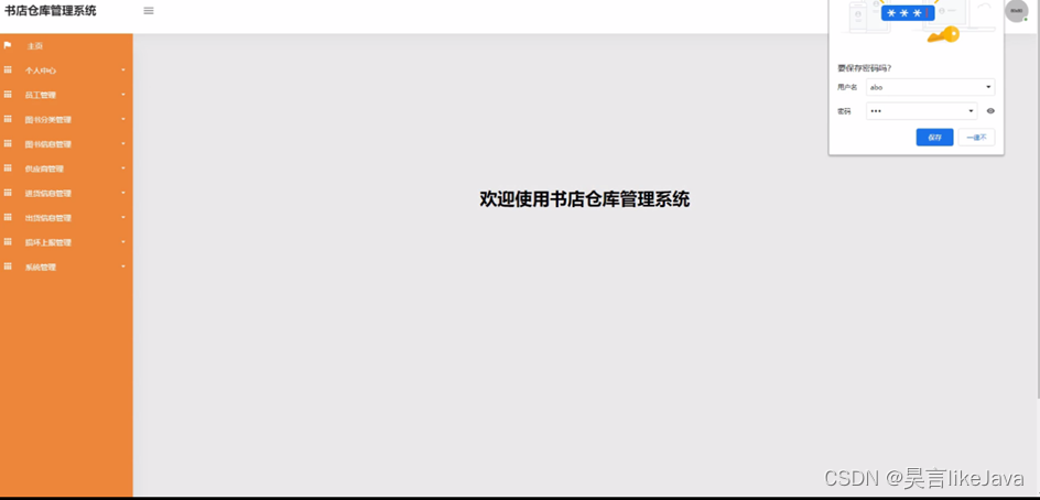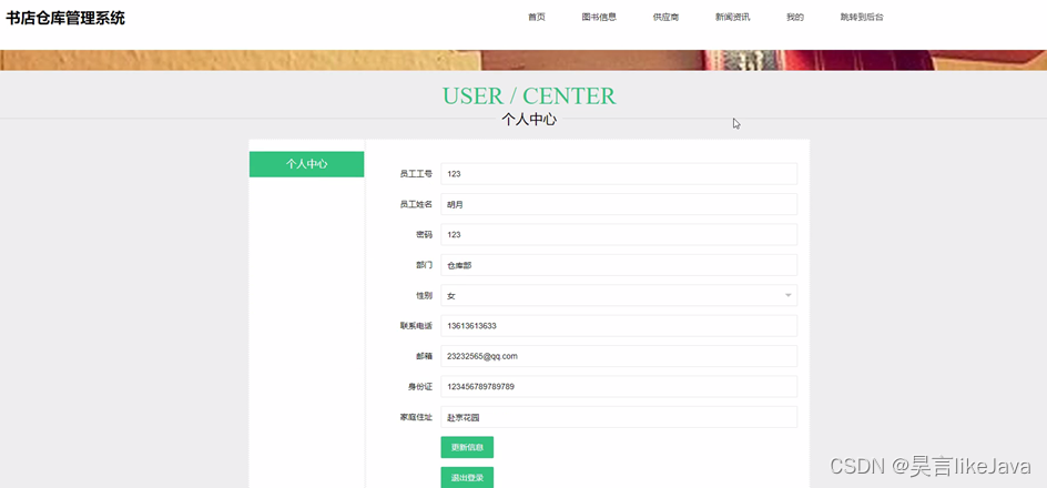 管理员通过用户名和密码填写完成后进行登录,如图5-1所示。管理员登录成功后进入到系统操作界面,可以对主页、个人中心、员工管理、图书分类管理、图书信息管理、供应商管理、进货信息管理、出货信息管理、损坏上报管理、系统管理等功能模块进行相对应操作。如图5-2所示