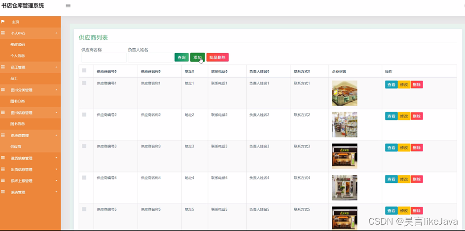 供应商管理:管理员通过列表可以获取供应商编号、供应商名称、地址、联系电话、负责人姓名、联系方式、企业封面等信息,进行修改或删除操作,如图5-6所示。