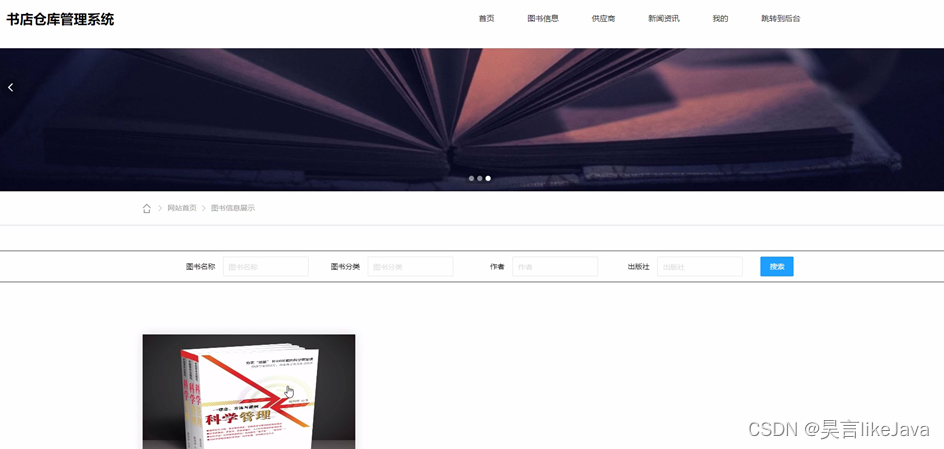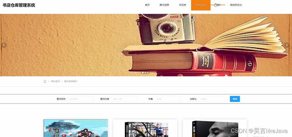 书店仓库管理系统,在书店仓库管理系统可以查看首页、图书信息、供应商、新闻资讯、我的、跳转到后台等内容,如图5-10所示。