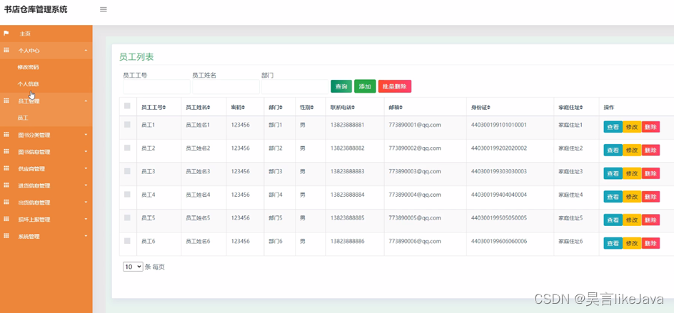 员工管理:通过列表可以获取员工工号、员工姓名、密码、部门、性别、联系电话、邮箱、身份证、家庭住址等信息,进行修改或删除操作,如图5-3所示。