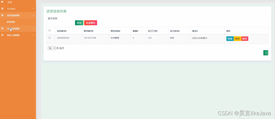 进货信息:管理员通过列表可以获取进货编号、图书编号、图书名称、数量、员工工号、员工姓名、备注等信息,进行修改或删除操作,如图5-7所示。