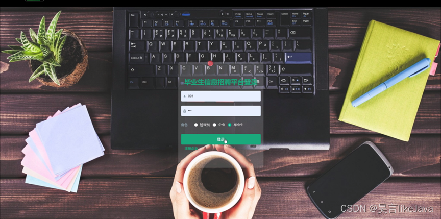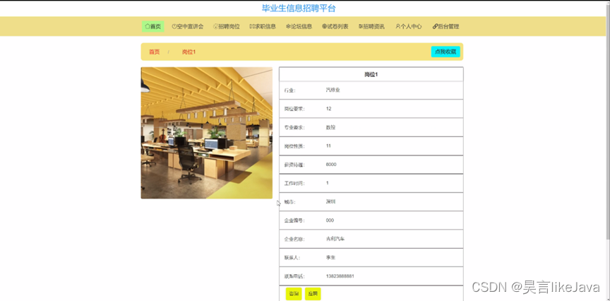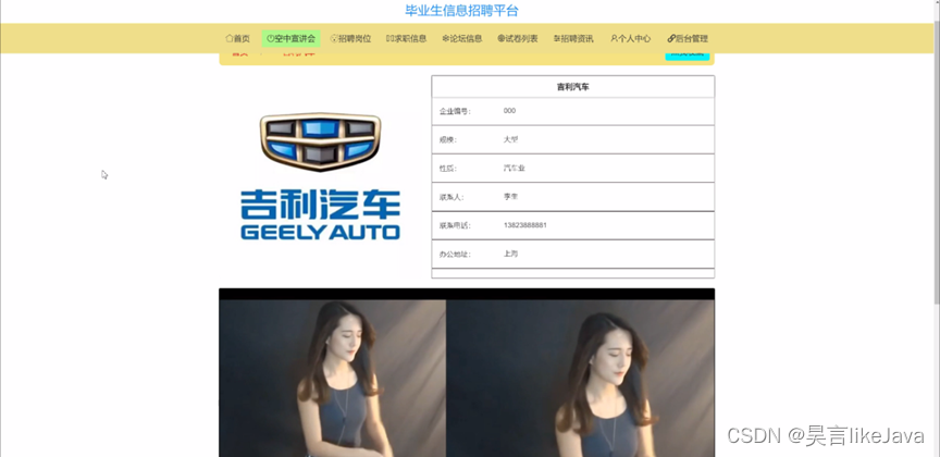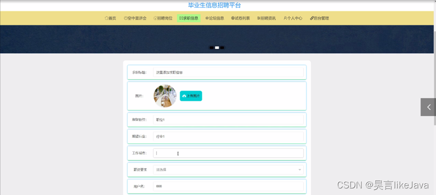 首页;首页,空中宣讲会,招聘信息,求职信息,论坛信息,试题列表,招聘信息,个人中心,后台管理模块的修改与维护。