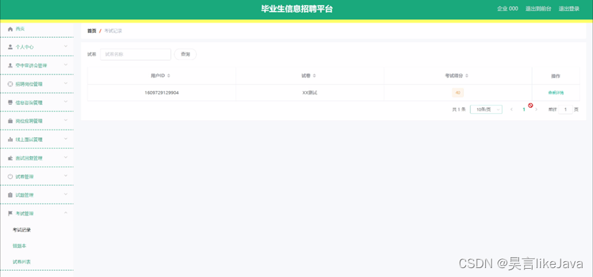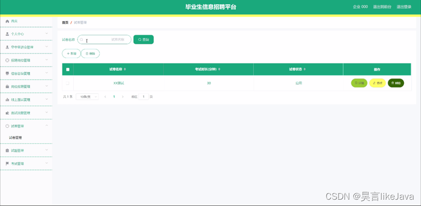企业;首页,个人中心,空中宣讲会管理,招聘职位管理,信息咨询管理,职位应聘管理,线上面试管理,面试回复管理,试卷管理,试题管理,考试管理,