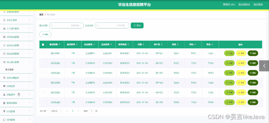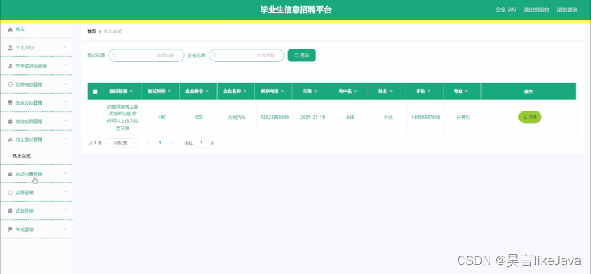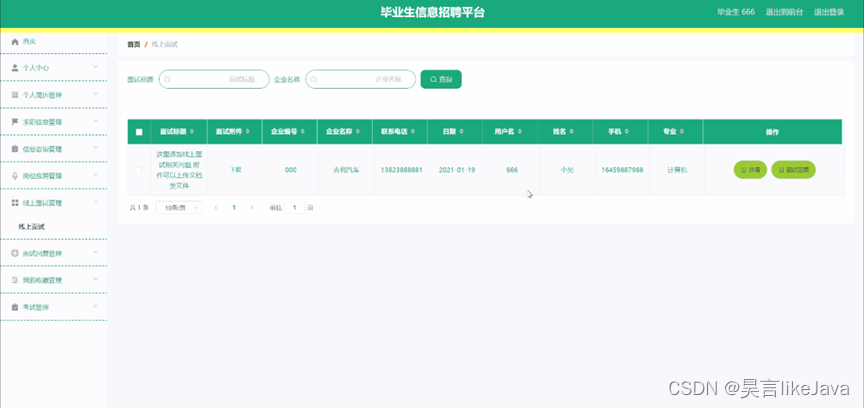 线上面试管理,在线上面试管理页面可以查看面试标题、面试附件、企业编号、企业名称、联系电话、日期、用户名、姓名、手机、专业等内容,并可根据需要对线上面试管理进行详情等操作,如图5-16所示。