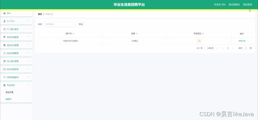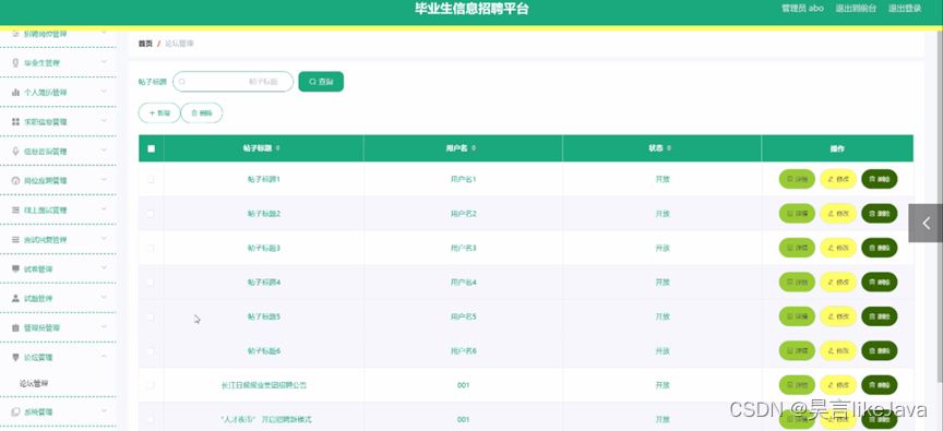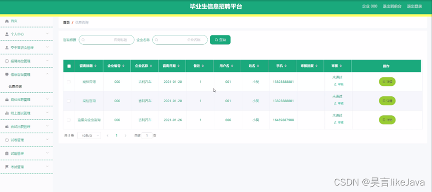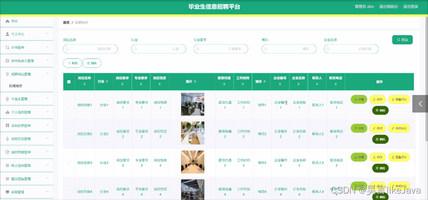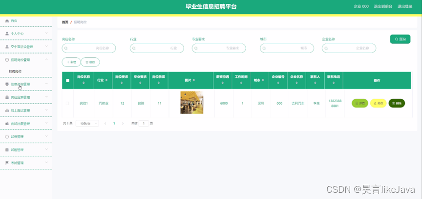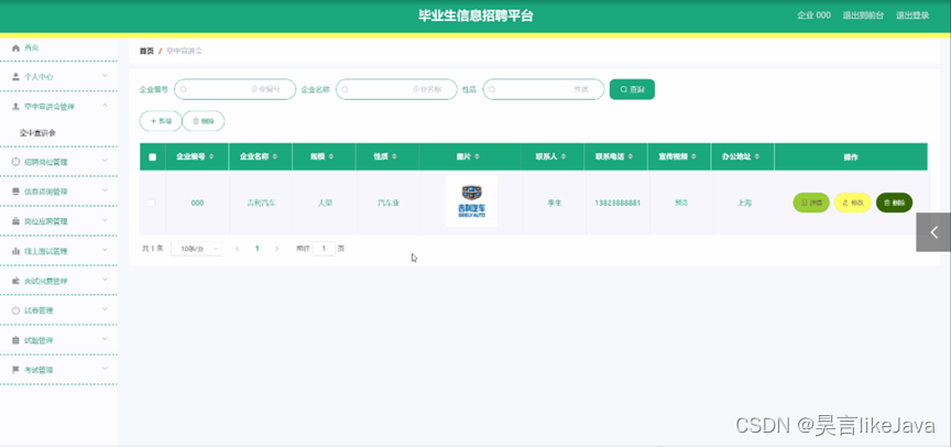 管理员;首页,个人中心,企业管理,空中宣讲会管理,招聘职位管理,毕业生管理,个人简历管理,求职信息管理,信息咨询管理,岗位应聘管理,线上面试管理,面试回复管理,试卷管理,试题管理,管理员管理、论坛管理、系统管理、考试管理,