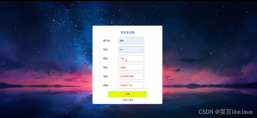 登录、毕业生注册,在毕业生注册页面通过填写用户名、密码、姓名、专业、手机、邮箱等信息进行登录、毕业生注册,如图5-25所示。