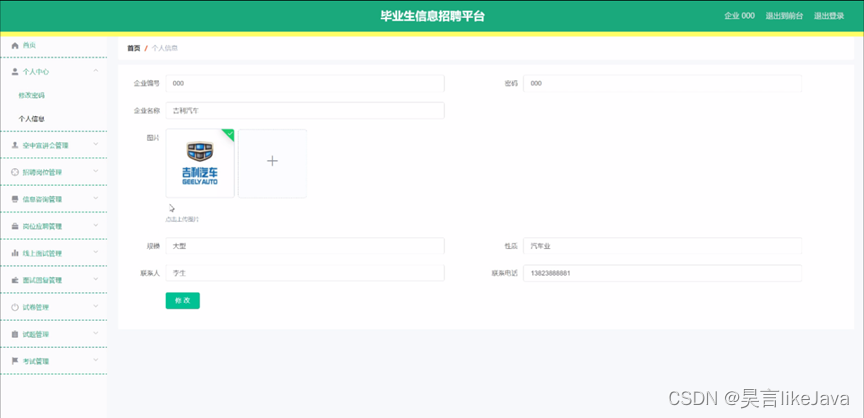 个人信息,在个人信息页面通过填写企业编号、密码、企业名称、图片、规模、性质、联系人、联系电话等内容并可根据需要对个人信息进行查看、修改,如图5-12所示。