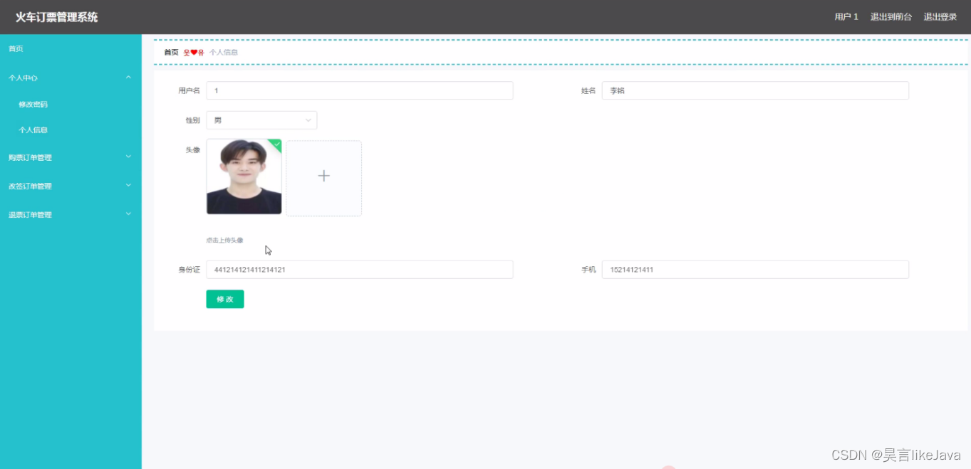 个人信息,在个人信息页面中可以查看用户名、密码、姓名、性别、头像、身份证、手机等信息内容,并且根据需要对已有个人信息进行修改等其他详细操作,如图5-13所示。