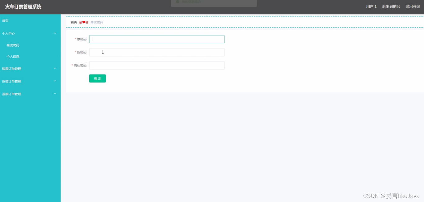 个人中心,在个人中心页面中通过填写原密码、新密码、确认密码等信息,还可以根据需要对个人中心进行修改、删除如图5-12所示。