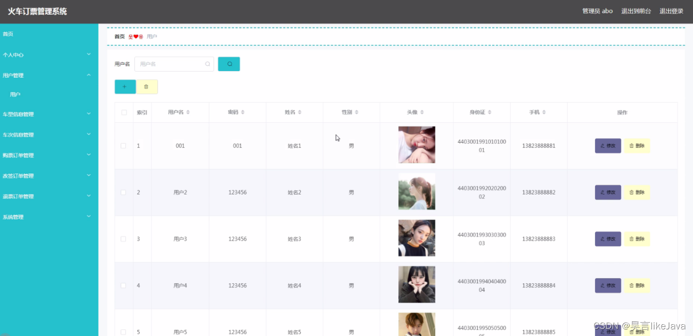 个人信息,在个人信息页面中可以通过填写用户名等内容进行修改、添加,如图5-5所示。还可以根据需要对用户管理的用户名、密码、姓名、性别、头像、身份证、手机进行添加,修改或删除等详细操作,如图5-6所示。