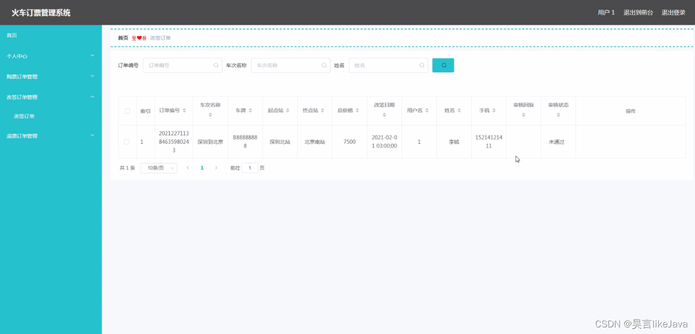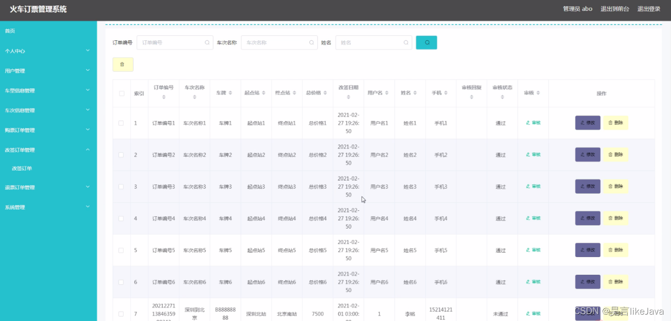 改签订单管理,在改签订单管理页面中可以查看订单编号、车次名称、车牌、起点站、终点站、总价格、改签日期、用户名、姓名、手机、审核回复、审核状态、审核等内容,并且根据需要对已有改签订单管理进行修改或删除等详细操作,如图5-10所示。