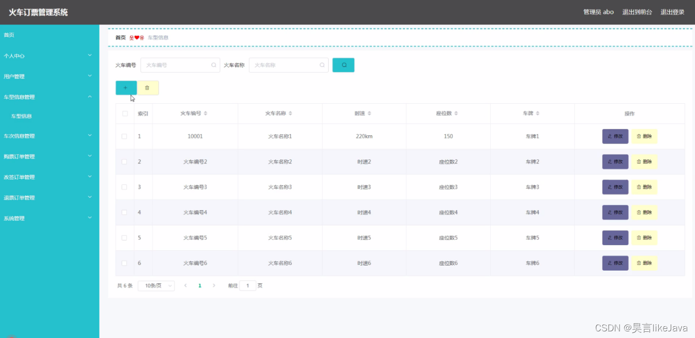 车型信息管理,在车型信息管理页面中可以填写火车编号、火车名称、实速、座位数、车牌等信息,并可根据需要对已有车型信息管理进行修改或删除等操作,如图5-7所示。