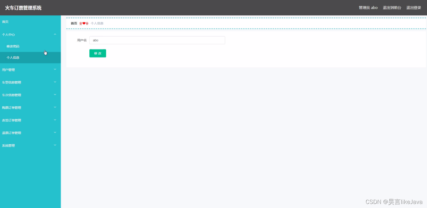 用户登录进入火车订票管理系统可以查看首页、个人中心、购票订单管理、改签订单管理、退票订单管理等内容。