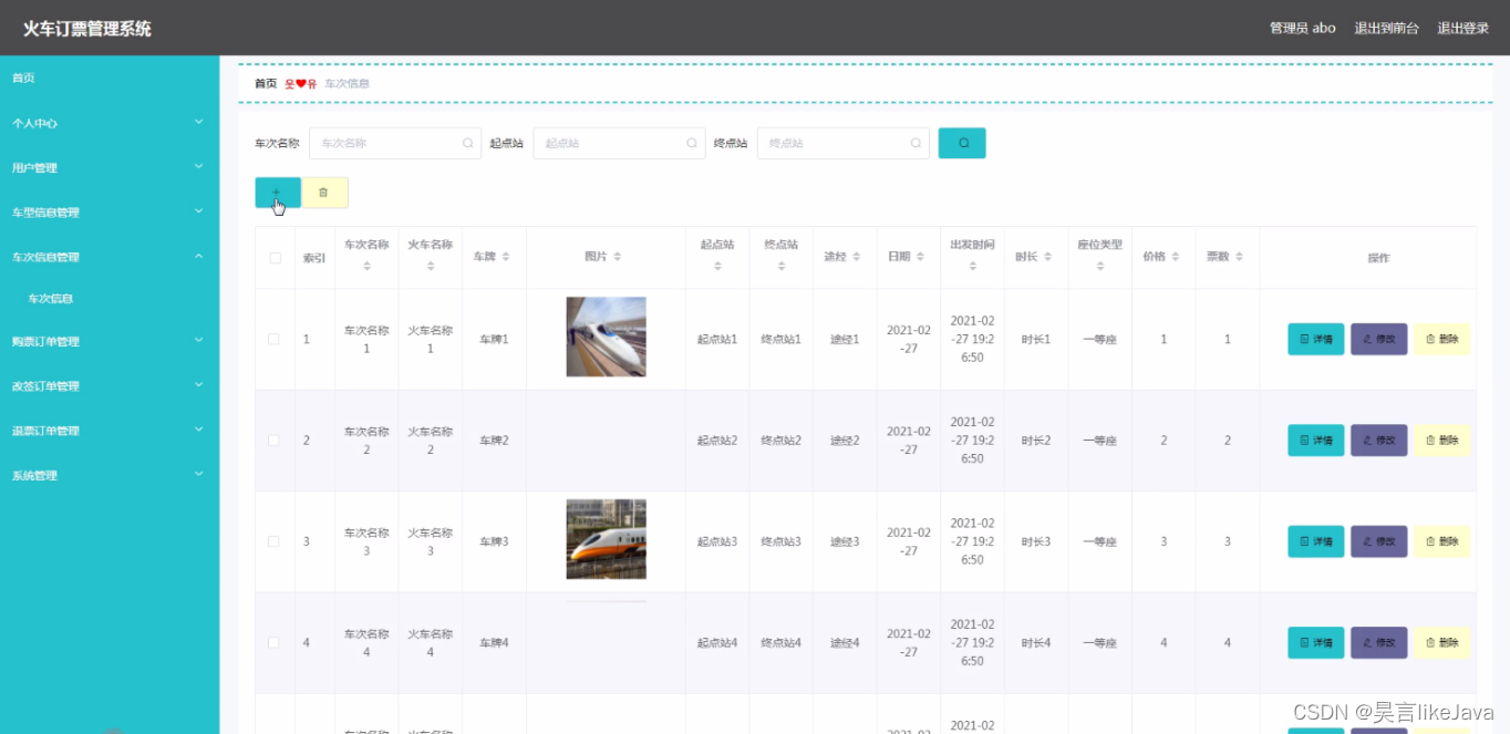 车次信息,在车次信息页面通过填写车次名称、火车名称、车牌、图片、起点站、终点站、途经、日期、出发时间、时长、座位类型、价格、票数等信息。如图5-3所示。