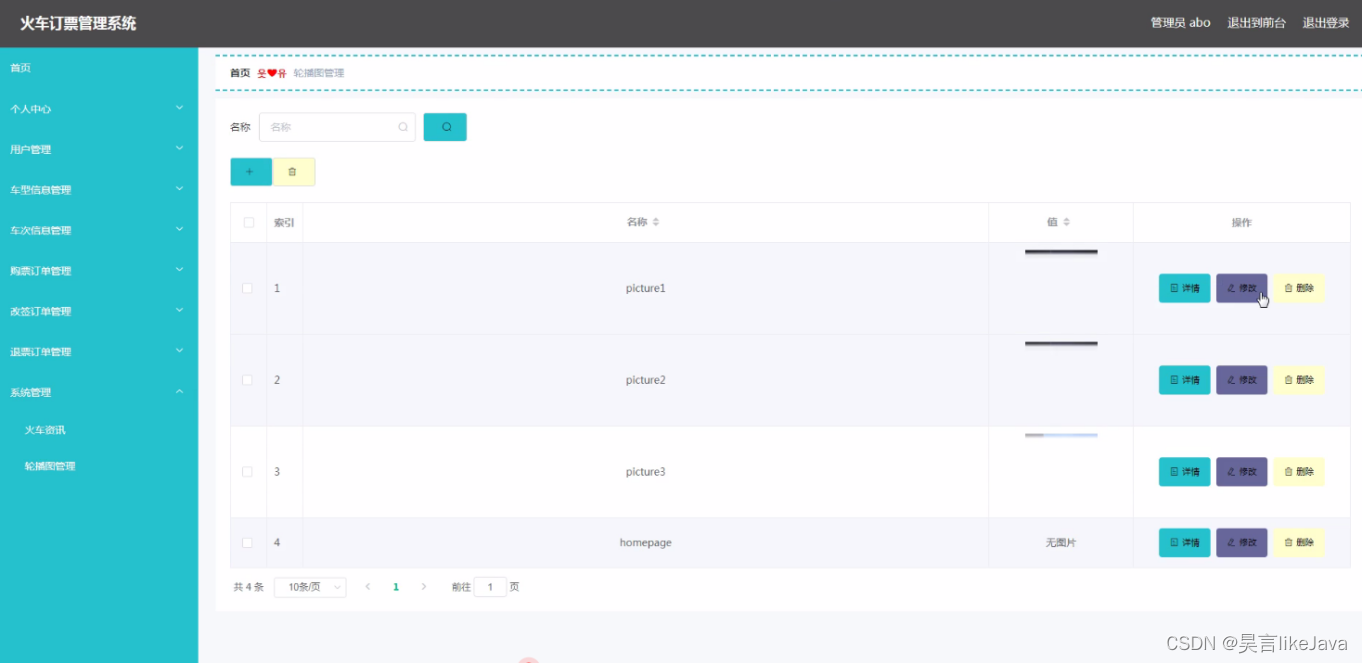 列车订票管理系统以管理员和用户为主,其实现的功能有:管理员:首页,个人中心,用户管理,车型信息管理,车次信息管理,购票订单管理,退票订单管理,系统管理;用户:首页,个人中心,购票订单管理,改签订单管理,退票订单管理,前台首页;首页,车次信息,列车信息,个人中心,后台管理等。因为这个站点的功能模块的设计是非常完善的,因此,它可以使整个列车预订管理系统的信息管理流程得以实现。。
