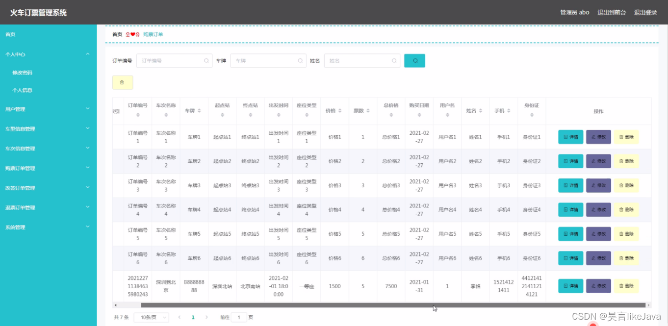 购票订单管理,在购票订单管理页面中可以查看订单编号、车次名称、车牌、起点站、终点站、出发时间、座位类型、价格、票数、总价格、购买日期、用户名、姓名、手机、身份证等内容,并且根据需要对已有购票订单管理进行修改或删除、详情等操作,如图5-9所示。