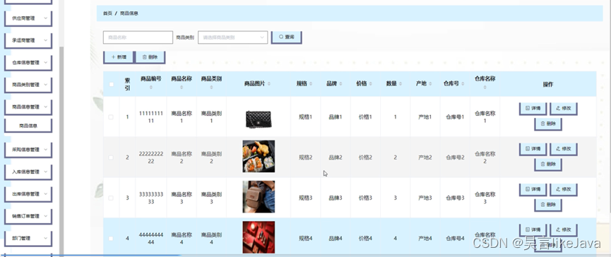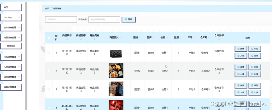 商品信息管理,在商品信息管理页面中可以查看索引、商品编号、商品名称、商品类别、商品图片、规格、品牌、价格、数量、产地、仓库号、仓库名称等内容进行详情、采购、入库或出库等操作;如图4-16所示。
