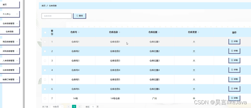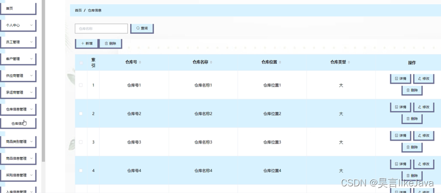 仓库信息管理,在仓库信息管理页面中可以查看索引、仓库号、仓库名称、仓库位置、仓库类型等内容进行详情等操作,如图4-15所示。