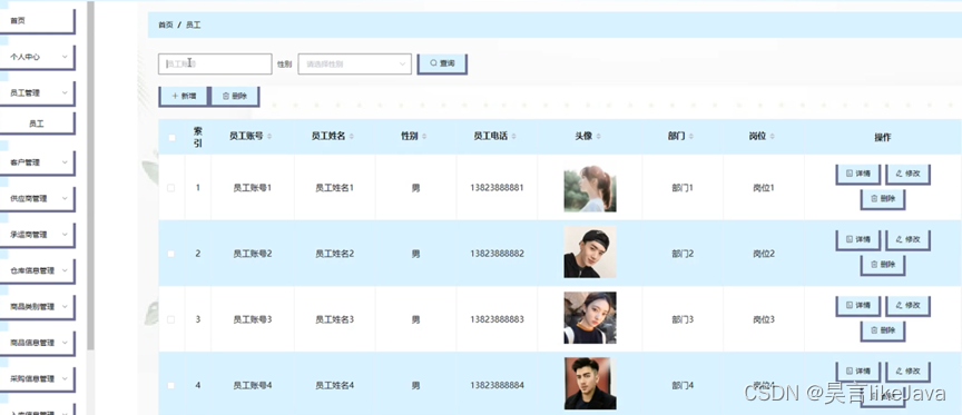 员工管理;在员工管理页面中可以查看索引、员工账号、员工姓名、性别、员工电话、头像、部门、岗位等内容进行详情、修改或删除等操作;如图4-4所示。