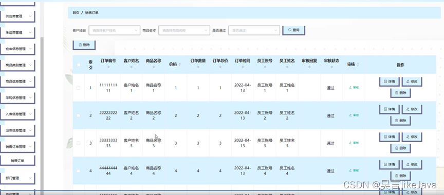 销售订单管理;在销售订单管理页面中可以查看索引、订单编号、客户姓名、商品名称、 价格、订单数量、订单总价、订单时间、员工账号、员工姓名、审核回复、审核状态、审核等内容进行详情、修改或删除等操作;如图4-11所示。