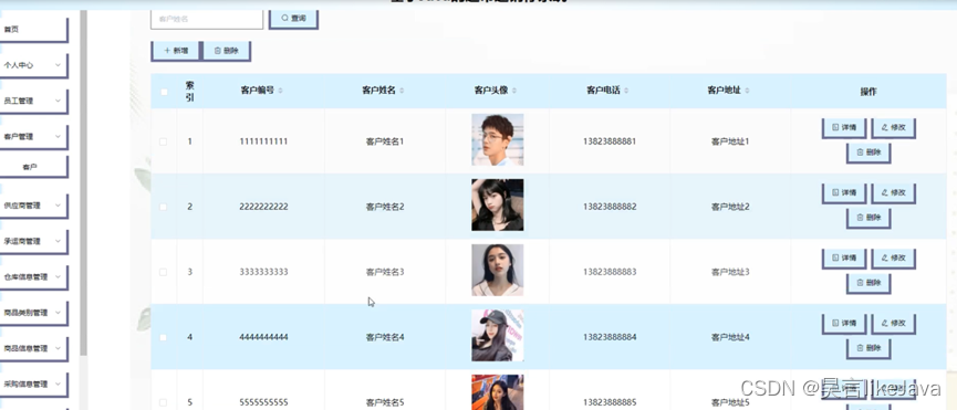 客户管理,在客户管理页面中可以查看索引、客户编号、客户姓名、客户头像、客户电话、客户地址等内容进行详情、修改或删除等操作,如图4-5所示。