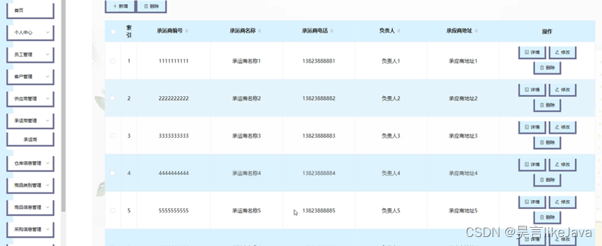 承运商管理,在承运商管理页面中可以查看索引、承运商编号、承运商名称、 承运电话、负责人、承运商地址等内容进行详情、修改或删除等操作,如图4-7所示。