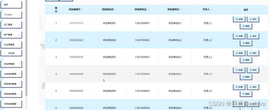 供应商管理,在供应商管理页面可以查看索引、供应商编号、供应商名称、供应商电话、供应商地址、负责人等内容进行详情、修改或删除等操作,如图4-6所示。