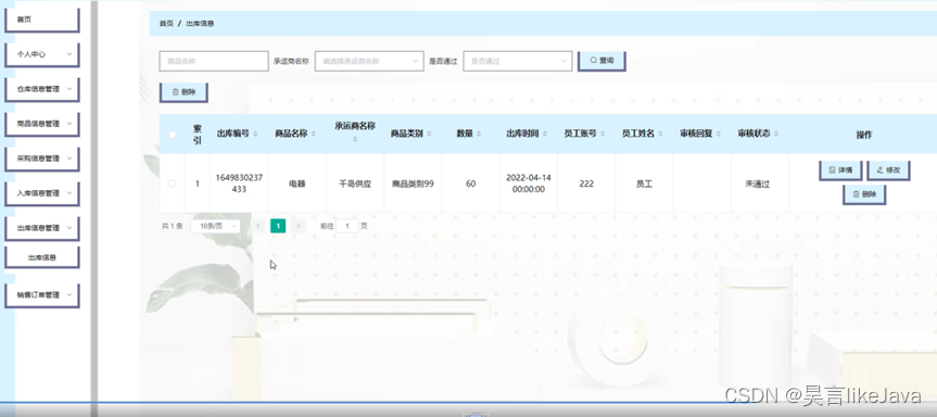 出库信息管理、在出库信息管理页面中可以查看索引、入库编号、商品名称、商品类别、出库时间、数量、员工账号、员工姓名、审核回复、审核状态等内容进行详情、修改或删除等操作,如图4-19所示。