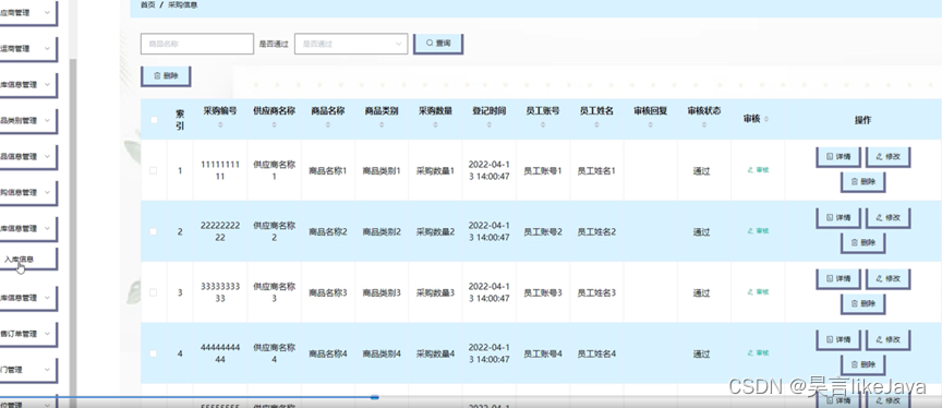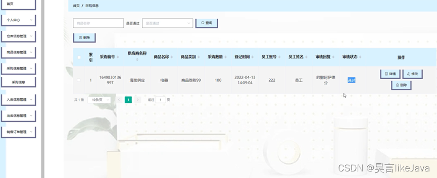 采购信息管理;在采购信息管理页面中可以查看索引、采购编号、供应商名称、商品名称、 商品类型、采购数量、登记时间、员工账号、员工姓名、审核回复、审核状态、审核等内容进行详情、修改或删除等操作;如图4-10所示。