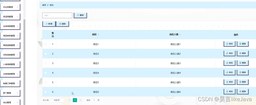 岗位管理,在岗位管理页面可以查看索引、岗位、岗位人数等内容进行修改或删除等操作;如图4-13所示。