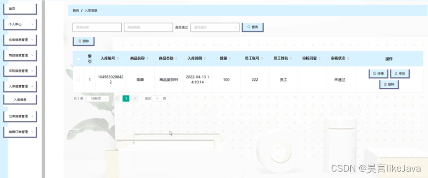 入库信息管理,在入库信息管理页面中可以查看索引、入库编号、商品名称、商品类别、入库时间、数量、员工账号、员工姓名、审核回复、审核状态等内容进行详情、修改或删除等操作;如图4-18所示。