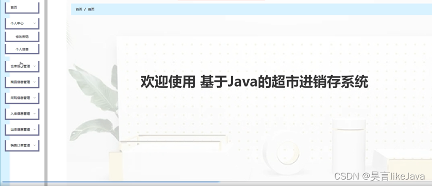 员工登录进入超市进销存系统可以查看首页、个人中心、仓库信息管理、 商品信息管理、采购信息管理、入库信息管理、出库信息管理、销售订单管理等功能进行详细操作;如图4-14所示。