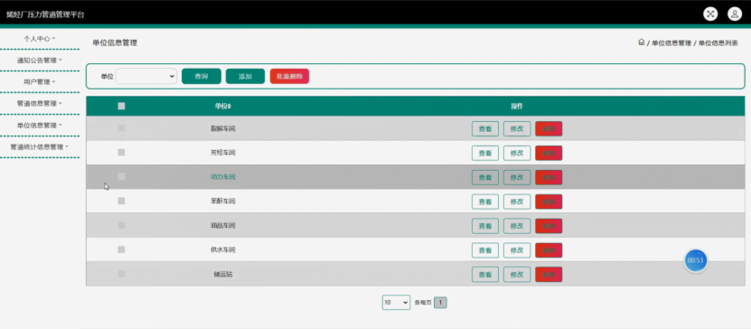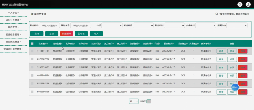 管道信息管理,在管道信息管理页面可以对管道编号、管道名称、公称直径、公称壁厚、管道长度、压力操作、压力设计、温度操作、温度设计、介质、管道材质、管道级别、安全级别、所属单位等内容进行查看,修改或删除操作,如图5-6所示。