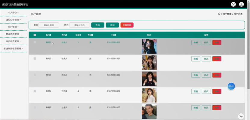 用户管理,在用户管理页面可以对账号、姓名、年龄、性别、手机、照片等内容进行查看,修改和删除等操作,如图5-5所示。