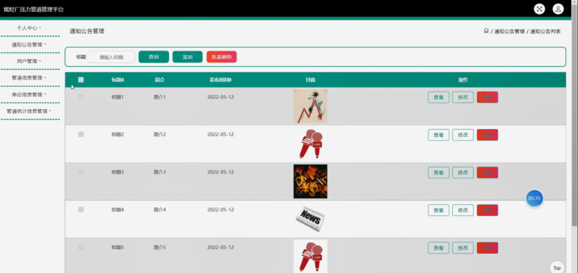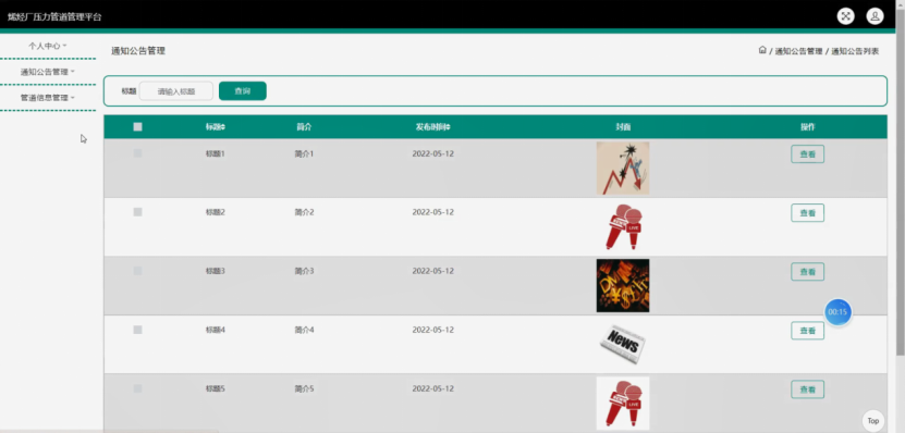 通知公告管理,在通知公告管理页面可以对标题、简介、发布时间、封面等内容进行查看,如图5-10所示。