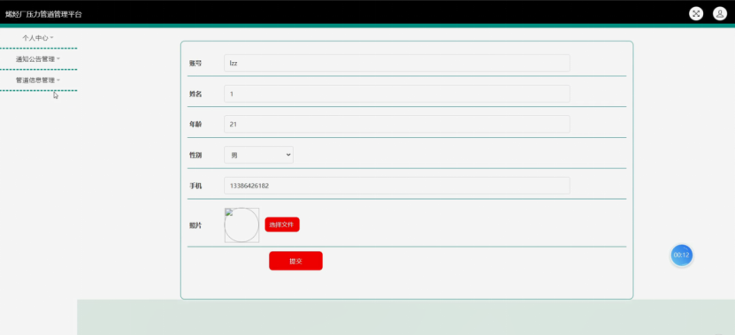 个人中心,在个人中心页面通过填写账号、姓名、年龄、性别、手机、照片等内容并提交进行个人信息修改操作,如图5-9所示。