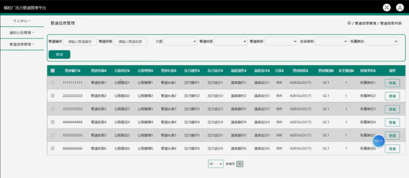 管道信息管理,在管道信息管理页面可以对管道编号、管道名称、公称直径、公称壁厚、管道长度、压力操作、压力设计、温度操作、温度设计、介质、管道材质、管道级别、安全级别、所属单位等内容进行查看,如图5-11所示。