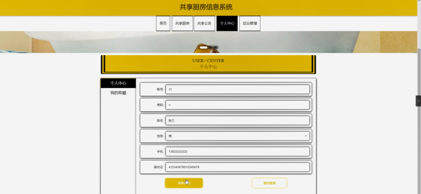 个人中心,在个人中心页面通过填写账号、密码、姓名、性别、手机、身份证等内容进行更新信息操作,还可以根据需要对我的收藏进行详细操作,如图5-4所示。